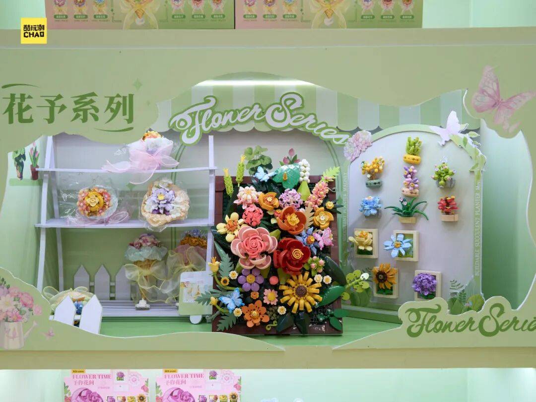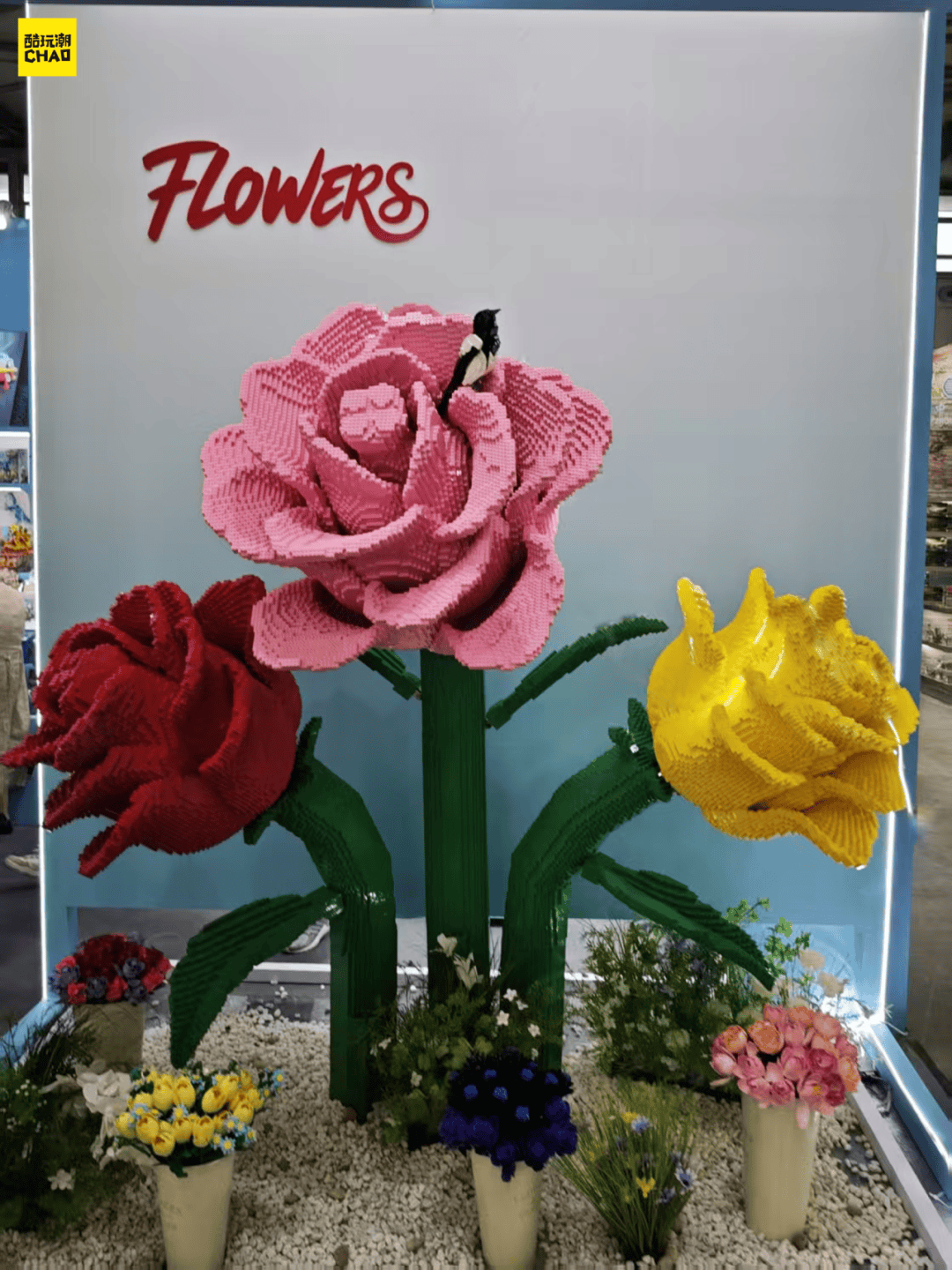 首先逛的是与酷玩潮同在一个展馆中的沃马积木,刚到展位就被三朵巨型的积木花震撼到了!工作人员介绍说这拼搭这三朵花消耗了超过 3 万块积木,需要两三个人才能搬动!