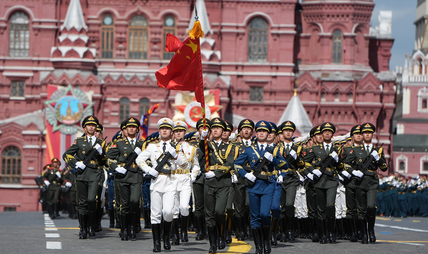这是5月9日,在俄罗斯首都莫斯科,中国人民三军仪仗队方队参加纪念苏联伟大卫国战争胜利80周年阅兵式。新华社记者 赖向东 摄