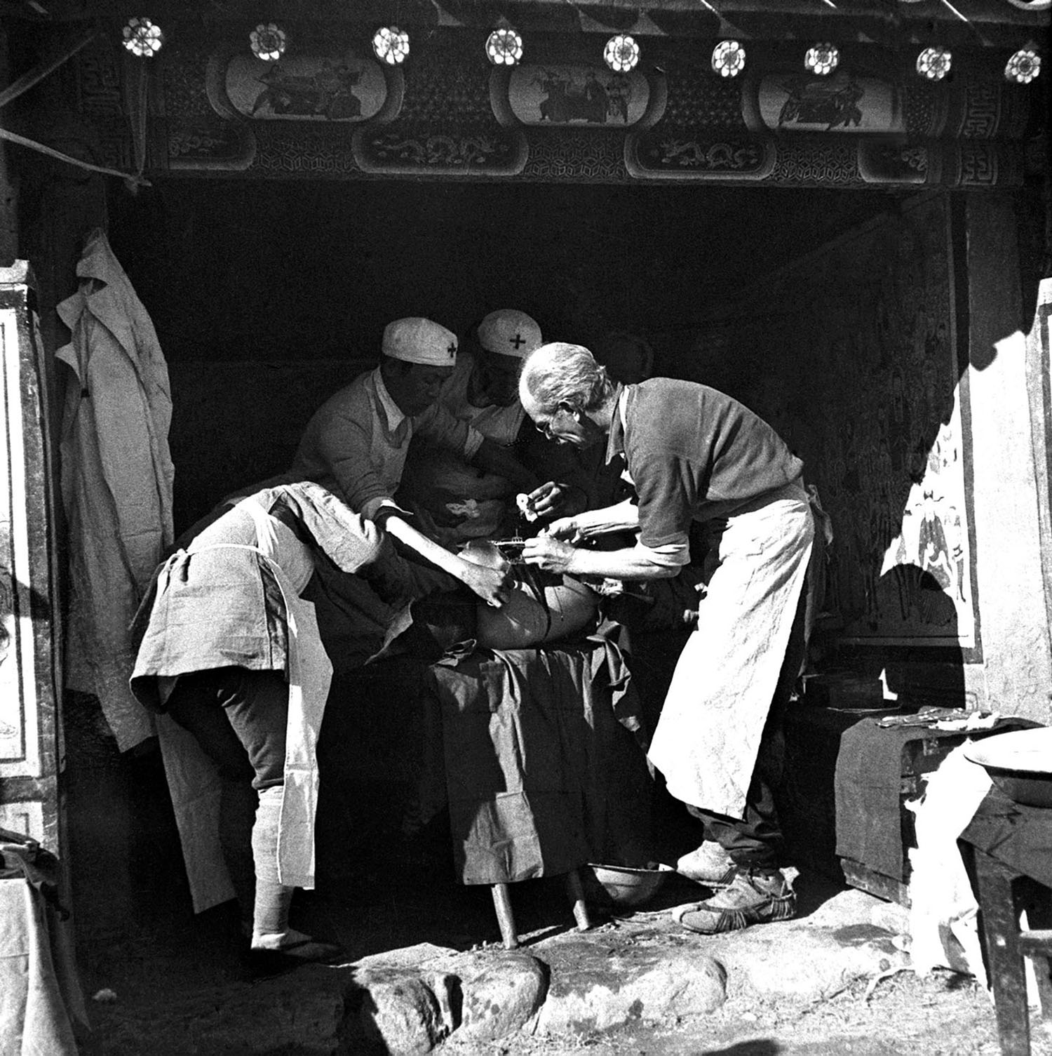 这是白求恩在晋察冀边区涞源县临时手术室里为伤员做手术。新华社发(资料图片)吴印咸 摄