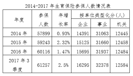 我市从2015年7月1日起实施生育保险按人头包干付费办法,并规范了生育津贴计发办法,杜绝了突击参保等现象的发生,这些政策的实施使2015年生育基金支出出现了负增长,同比下降9.4%。我市于2016年1月起实施了全面二孩政策,受政策影响,享受生育待遇的人次大幅增长,由2015年的1206人增长到2016年的1965人,增加了759人,增长率达到了63%。2017年二孩政策作用进一步显现,享受生育待遇的人次继续大幅增加,2017年前三季度享受生育保险待遇人次为3324人,比上年增加1359人,增长率为69%。预计2017年全年享受生育待遇人数将达到4000余人,比上年增长100%左右。近两年年均增长1397人,增长率为115%。