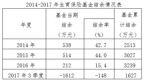根据上图,2016年1月实施全面二孩政策以来,我市生育保险基金支付压力明显增大,基金当期结余呈急速下降趋势。2017年3季度末生育保险基金当期结余-1612万元,严重收不抵支。