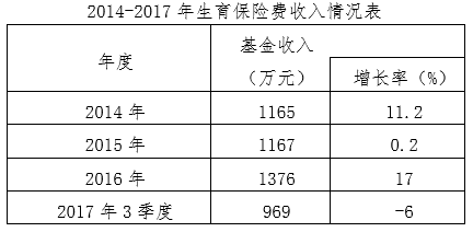 根据上图,我市2014年、2015年生育保险费收入基本稳定在1160余万元水平。二孩政策实施的2016、2017年,收入略有增加,但也稳定在1300万元左右。2017年月缴费基数总额为30893万元,按照平均费率0.35%计算,每月征收保险费108万元,第四季度预计征收324万元,全年征收1293万元。近两年年均生育保险费收入增长63万元,增长率为5.3%。