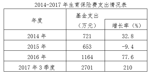 随着享受生育待遇人次的大幅增长,生育保险费支出也大幅增长。 2016年生育保险费支出1164万元,比上年增加543万元,增长率为77.6%。2017年前三季度生育保险费支出2701万元,预计全年将达到3500万元,比上年增长2340万元,增长率为201%。近两年年均生育保险费支出增长1423万元,增长率为218%。
